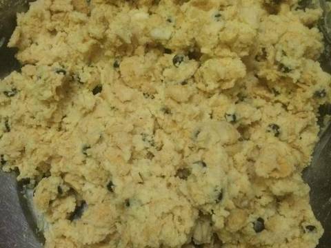 - Masukkan tepung, aduk rata. Tambahkan cornflakes, choco chip, almond & vanilla, aduk kembali hingga tercampur menjadi satu.
